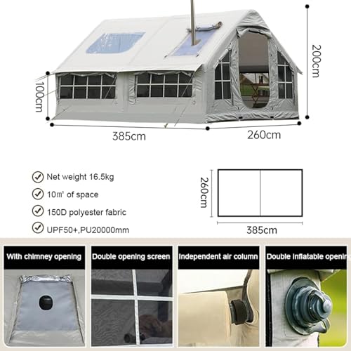 - Mit den Maßen 385 x 260 x 200 cm (H) bietet dieses geräumige aufblasbare Campingzelt bequem Platz für 2 bis 6 Personen. Mit reichlich Platz für ein aufblasbares Bett, eine Couch, einen Tisch und andere Einrichtungsgegenstände garantiert dieses Zelt ein entzückendes Camping-Erlebnis für Sie und Ihre Familie.
